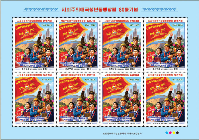 This photo, captured from the website of North Korea's State Stamp Bureau on Jan. 8, 2026, shows stamps celebrating the 80th anniversary of the Socialist Patriotic Youth League's foundation. The bureau said it will issue those stamps on Jan. 17. (PHOTO NOT FOR SALE) (Yonhap)