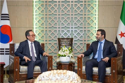 South Korean Foreign Minister Cho Tae-yul (L) holds talks with Syrian Foreign Minister Asaad al-Shaibani in Damascus on April 10, 2025, in this photo provided by the foreign ministry in Seoul. The two countries signed a joint statement on the establishment of diplomatic ties. (PHOTO NOT FOR SALE) (Yonhap)