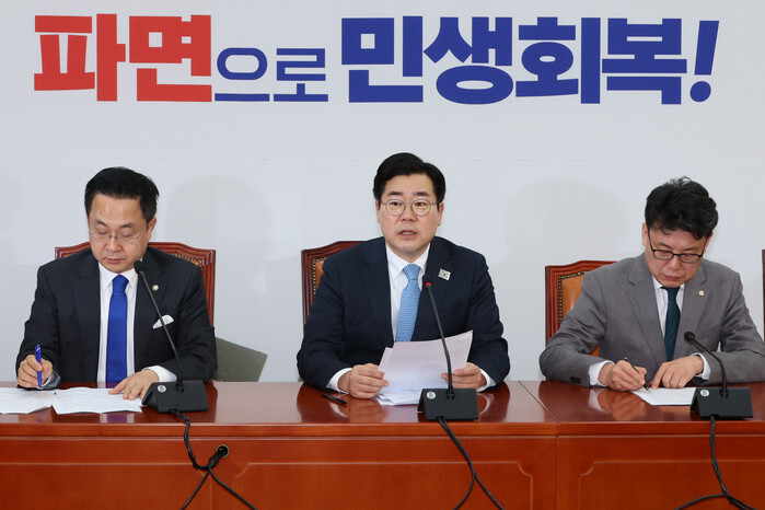 Park Chan-dae (C), floor leader of the main opposition Democratic Party, speaks during a meeting of the party at the National Assembly in Seoul on March 11, 2025. (Yonhap)