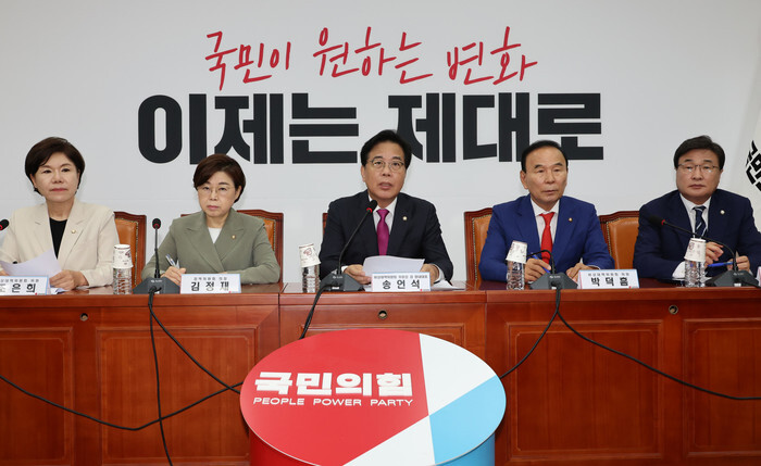 Song Eon-seog (C), leader of the main opposition People Power Party's emergency leadership committee, speaks during a meeting of the committee at the National Assembly in Seoul on July 7, 2025. (Yonhap)