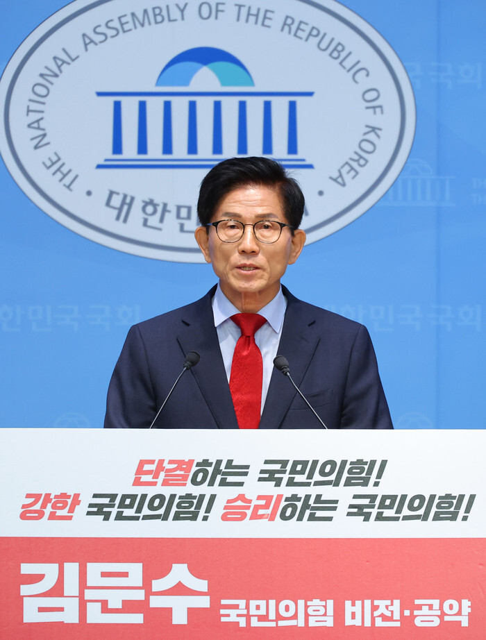 Former Labor Minister Kim Moon-soo, a candidate in the main opposition People Power Party's leadership race, holds a press conference at the National Assembly in Seoul on July 31, 2025, announcing his campaign pledges for the leadership election on Aug. 22. (Yonhap)