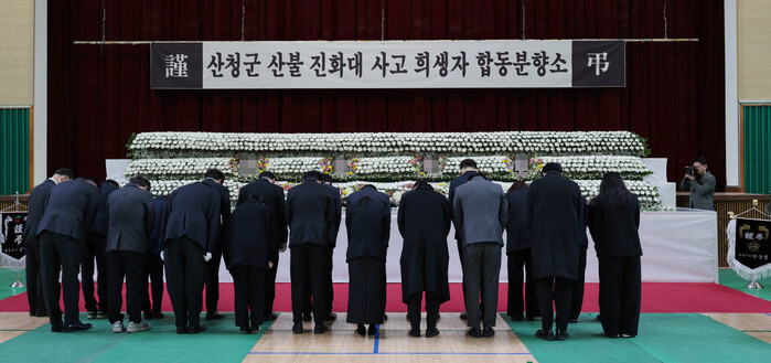 Mourners offer a silent prayer in front of an altar for four people killed in wildfires at a gymnasium in Changnyeong, South Gyeongsang Province, southeastern South Korea, on March 24, 2025, after they died in wildfires in the province's nearby town of Sancheong following their outbreak on March 21. (Yonhap)