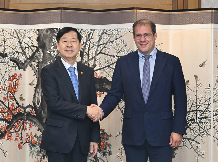 Finance Minister Koo Yun-cheol (L), who doubles as the deputy prime minister for economic affairs, shakes hands with David Clarinval, Belgium's minister for the economy, employment and agriculture, ahead of their talks at the government complex in Seoul on Sept. 17, 2025, in this photo released by the finance ministry. (PHOTO NOT FOR SALE) (Yonhap)