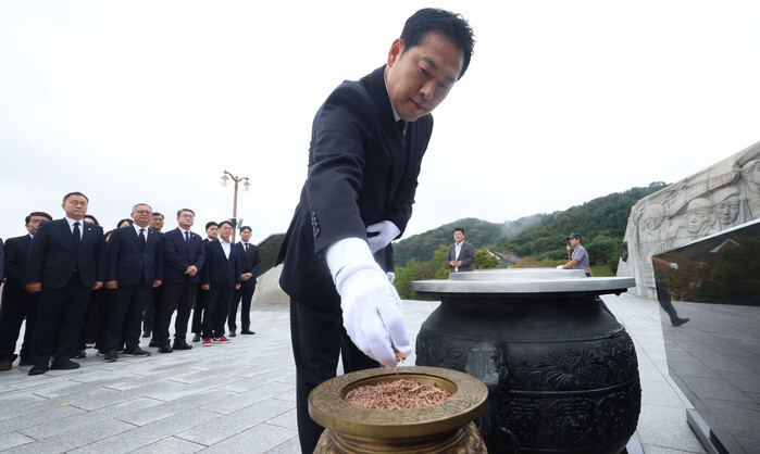Jang Dong-hyeok, leader of the main opposition People Power Party, burns incense in front of an altar at the March 15 National Cemetery in the southeastern coastal city of Changwon on Oct. 16, 2025, to pay tribute to democratic fighters killed in a 1960 pro-democracy demonstration in the city that added fuel to mounting public protests against the dictatorial regime of then President Rhee Syng-man. A nationwide protest took place on April 19, 1960, forcing the president to step down. (Yonhap)