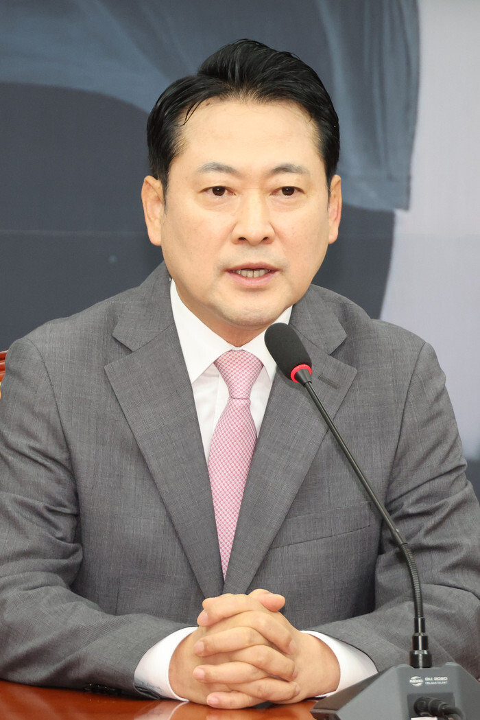 Jang Dong-hyeok, leader of the main opposition People Power Party, attends a press conference at the National Assembly in Seoul on Sept. 17, 2025, after a court issued a warrant to arrest Kweon Seong-dong, a lawmaker of the party, on charges of receiving illegal political funds in exchange for influence peddling. (Yonhap)