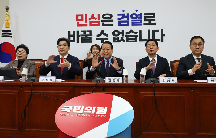 Kwon Young-se (C), chief of the ruling People Power Party's emergency leadership committee, and the committee's other members talk in sign language during a meeting of the committee at the National Assembly in Seoul on Feb. 3, 2025, to mark the Korean Sign Language Day. (Yonhap)