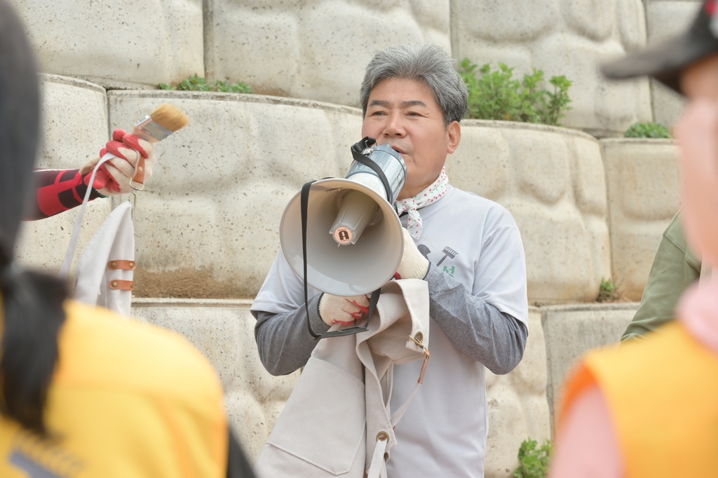 한 손에는 페인트 통, 한 손에는 붓을 든 사람들은 회색빛이 감도는 마을회관 옆 벽을 1시간도 채 되지 않아 빨간색, 분홍색, 초록색으로 알록달록 화사하게 물들였다.