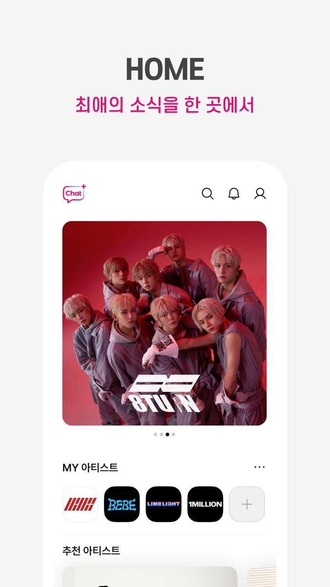 플러스챗은 다양한 팬덤 활동을 하나의 앱에서 즐길 수 있게 통합한 플랫폼으로, 기존 1.0에서는 아티스트와의 1대 1 채팅 등 서비스를 이용할 수 있었다.
