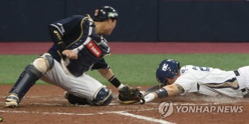 | ▲ 포수들의 대결 지난 18일 고척스카이돔 2020 프로야구 한국시리즈 2차전 두산 베어스와 NC 다이노스의 경기. 4회말 1사 만루. NC 알테어 외야플라이 때 3루 주자 양의지가 홈에서 아웃되고 있다. 비디오 판독 후에도 아웃. [연합뉴스 자료사진] |