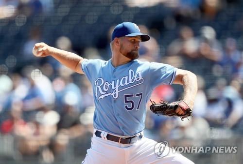 | ▲  In this Getty Images file photo from Aug. 18, 2019, Glenn Sparkman of the Kansas City Royals pitches against the New York Mets in the top of the first inning of a Major League Baseball regular season game at Kauffman Stadium in Kansas City, Missouri. (Yonhap) |