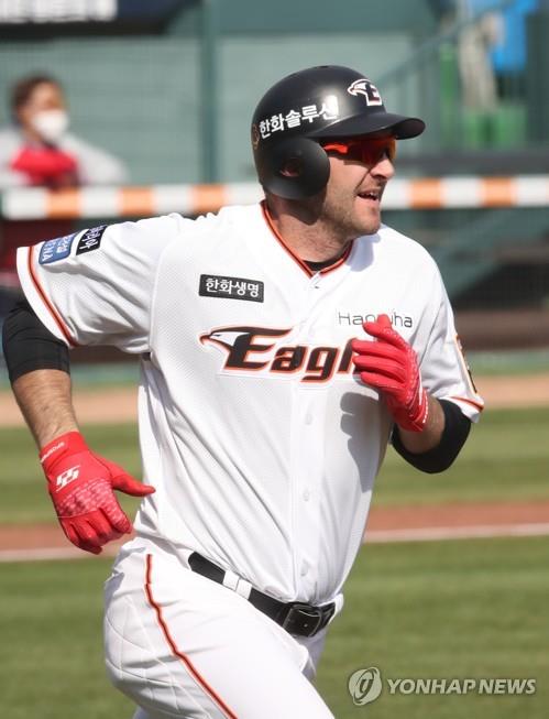 ▲ In this file photo from April 23, 2020, Jared Hoying, then of the Hanwha Eagles, heads to first base after a single against the Kia Tigers in the bottom of the sixth inning of a Korea Baseball Organization exhibition game at Hanwha Life Eagles Park in Daejeon, 160 kilometers south of Seoul. (Yonhap)