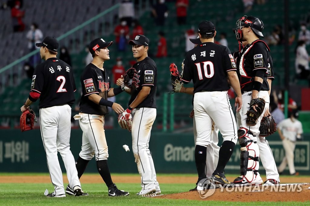 ▲ In this file photo from June 8, 2021, members of the KT Wiz celebrate their 4-2 victory over the SSG Landers in a Korea Baseball Organization regular season game at Incheon SSG Landers Field in Incheon, 40 kilometers west of Seoul. (Yonhap)
