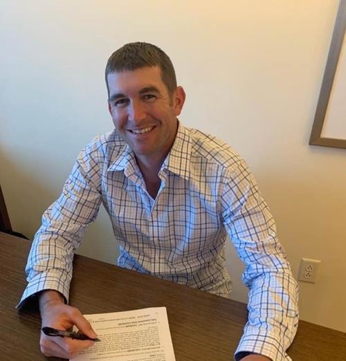 ▲ American outfielder Jared Hoying signs his contract with the KT Wiz of the Korea Baseball Organization, in this photo provided by the Wiz on June 26, 2021. (PHOTO NOT FOR SALE) (Yonhap)