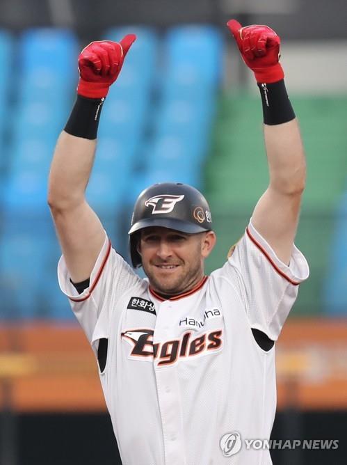 ▲ In this file photo from June 16, 2020, Jared Hoying, then of the Hanwha Eagles, celebrates his double against the LG Twins in the bottom of the second inning of a Korea Baseball Organization regular season game at Hanwha Life Eagles Park in Daejeon, 160 kilometers south of Seoul. (Yonhap)