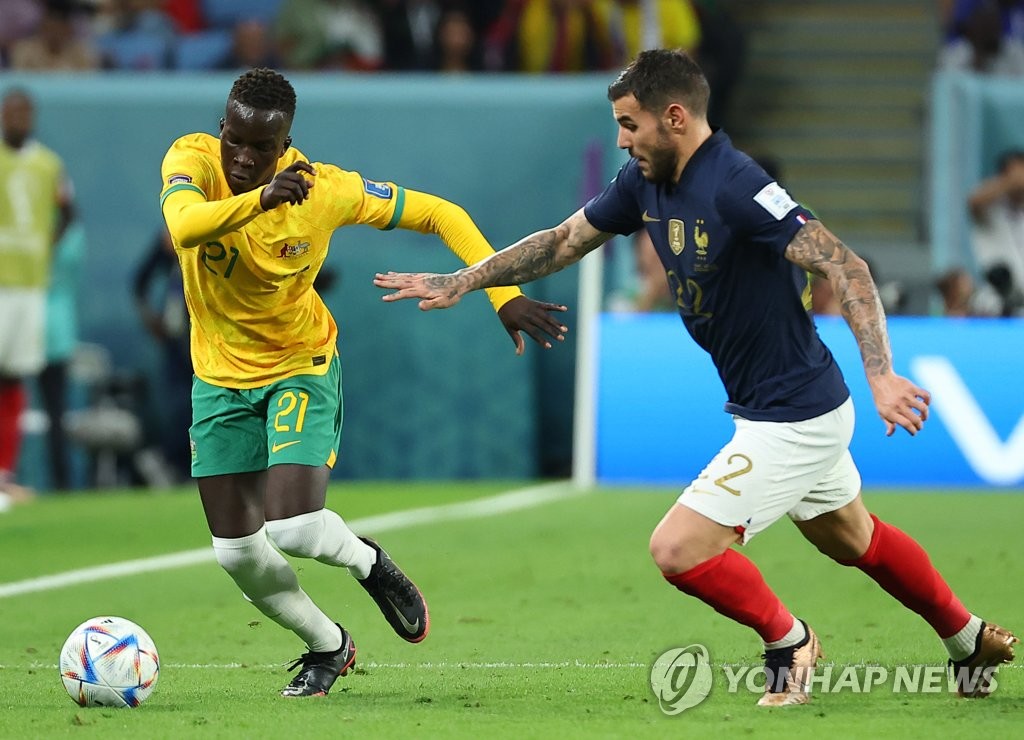 | ▲ 볼경합 벌이는 거랭 쿠얼과 테오 에르난데스 (알와크라=연합뉴스) 김도훈 기자 = 22일 오후(현지시간) 카타르 알와크라 알자누브 스타디움에서 열린 2022 카타르 월드컵 조별리그 D조 프랑스와 호주 경기. 거랭 쿠얼과 테오 에르난데스가 볼경합을 벌이고 있다. 2022.11.23 superdoo82@yna.co.kr |