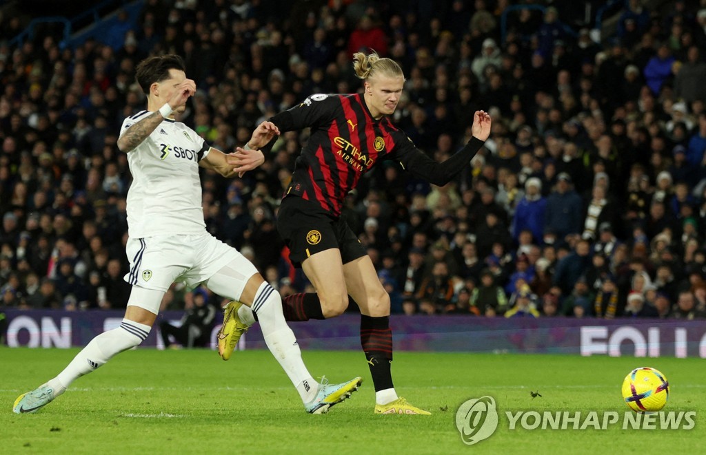 홀란은 29일(한국시간) 영국 리즈의 엘런드 로드에서 열린 리즈 유나이티드와 2022-2023시즌 잉글랜드 프로축구 프리미어리그(EPL) 17라운드 원정 경기에서 두 골을 몰아쳐 맨체스터 시티(맨시티)의 3-1 완승을 이끌었다.