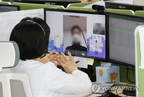 | ▲ A medical worker talks to a coronavirus-infected patient via video link at a medical facility in Seongnam, near Seoul, on Jan. 21, 2022, as the patient is being treated at home with Paxlovid, COVID-19 treatment pills developed by U.S. pharmaceutical giant Pfizer Inc. (Pool photo) (Yonhap) |