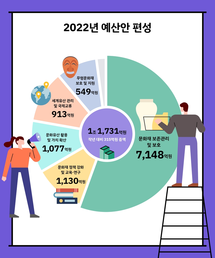 문화재청이 1일 공개한 2022년도 예산·기금 정부안에 따르면 이 사업을 포함해 전체 예산안은 1조1천731억 원으로 편성됐다.