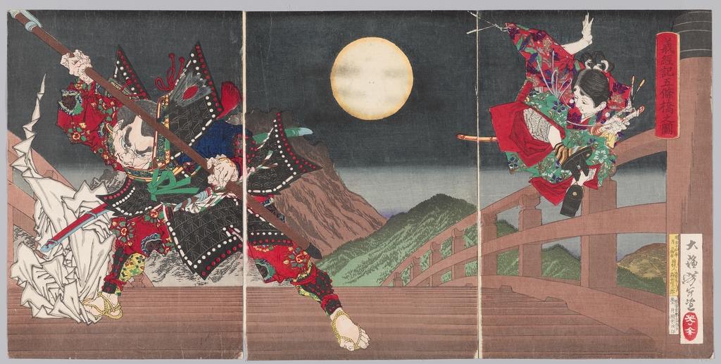 19세기에 활동한 우키요에 화가 쓰키오카 요시토시(月岡芳年)는 이 작품에서 미나모토노 요시쓰네(源義經·1159∼1189)와 부하 벤케이(弁慶)가 교토 고조(五條) 다리 위에서 만나 싸우는 장면을 묘사했다. 우키요에는 에도시대(1603∼1867)에 유행한 풍속화로, 주로 목판화 형태로 제작됐다.