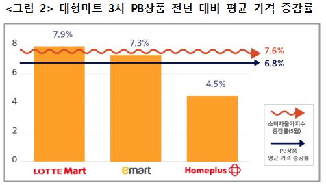 업체별 작년 동기 대비 PB상품 가격 증감률은 롯데마트(7.9%), 이마트(7.3%), 홈플러스(4.5%) 순으로 각각 조사됐다.