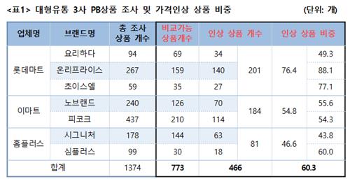 한국여성소비자연합은 지난 5월 3∼13일 이마트[139480], 롯데마트, 홈플러스에서 1천374개 PB상품 중 가격비교가 가능한 773개 상품을 분석한 결과 466개(60.3%) 상품 가격이 인상됐다고 6일 밝혔다.