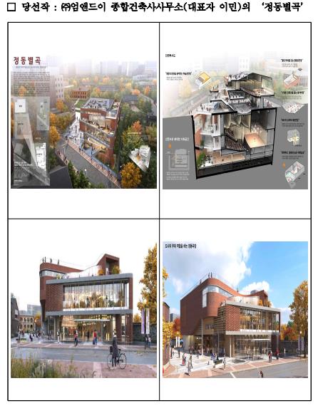 당선작 '정동별곡'은 중명전과 정동길을 아우르는 조형 계획과 붉은 벽돌을 활용하는 재료 계획으로, 지난 27년간 정동을 지켜 온 국립정동극장의 정체성을 계승했다는 평가를 받았다.