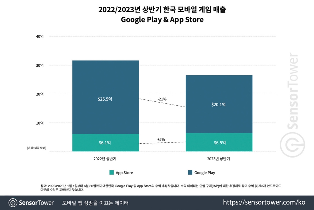 (서울=연합뉴스) 김주환 기자 = 모바일 데이터 분석 업체 센서타워는 올해 상반기 국내 모바일 게임 총매출액이 작년 동기 32억 달러 대비 16% 감소한 27억 달러를 기록했다고 18일 밝혔다.