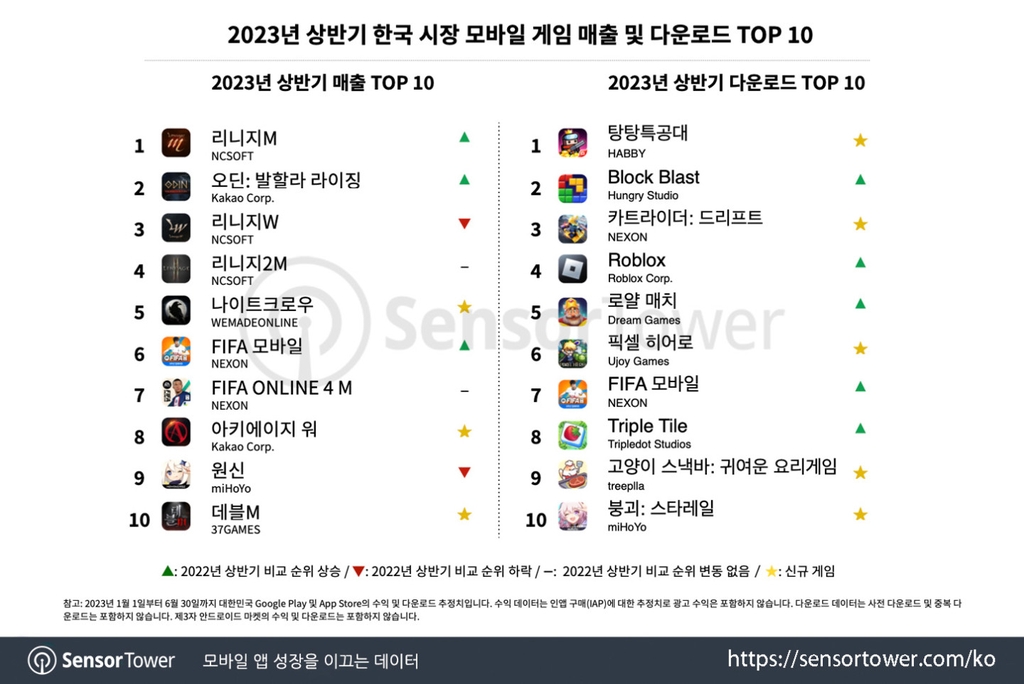 | ▲ 2023년 상반기 국내 모바일게임 매출·다운로드 순위 [센서타워 제공. 재판매 및 DB 금지] |