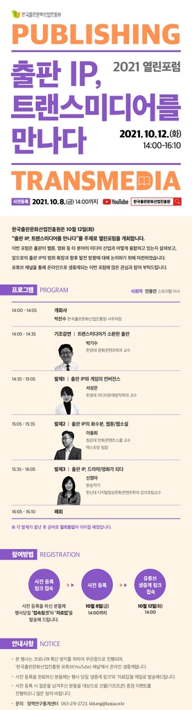 (서울=연합뉴스) 송광호 기자 = ▲ 문화체육관광부와 한국출판문화산업진흥원은 10월 12일 오후 2시 온라인 생중계로 '2021 열린 포럼'을 진행한다.