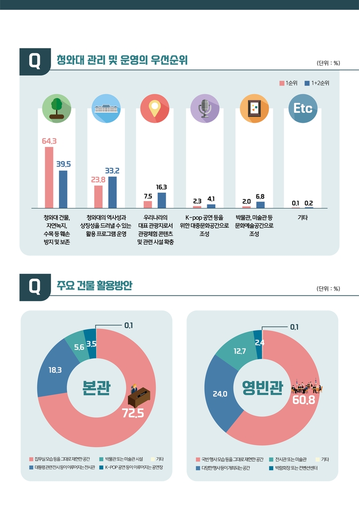 관람객의 64.3%는 우선순위로 '청와대 건물, 자연녹지, 수목 등의 훼손 방지 및 보존'을 꼽았고, '청와대의 역사성과 상징성을 드러낼 수 있는 활용 프로그램 운영'이라는 답변은 23.8%로 다소 차이가 있었다.