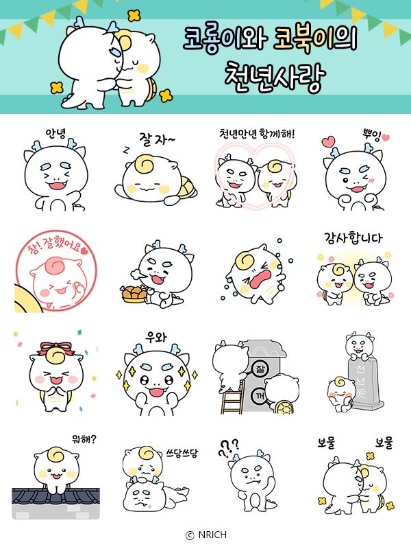 이번에 배포하는 '코룡이와 코북이의 천년 사랑' 그림말은 비문의 내용이 영원히 전해지기를 기원하며 비석에 조각했던 용과 거북이의 전통 문양을 현대적으로 재해석한 것이다.