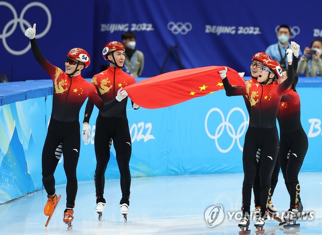 | ▲  Members of the Chinese short track speed skating mixed relay team celebrate their gold medal at the Beijing Winter Olympics at Capital Indoor Stadium in Beijing on Feb. 5, 2022. (Yonhap) |