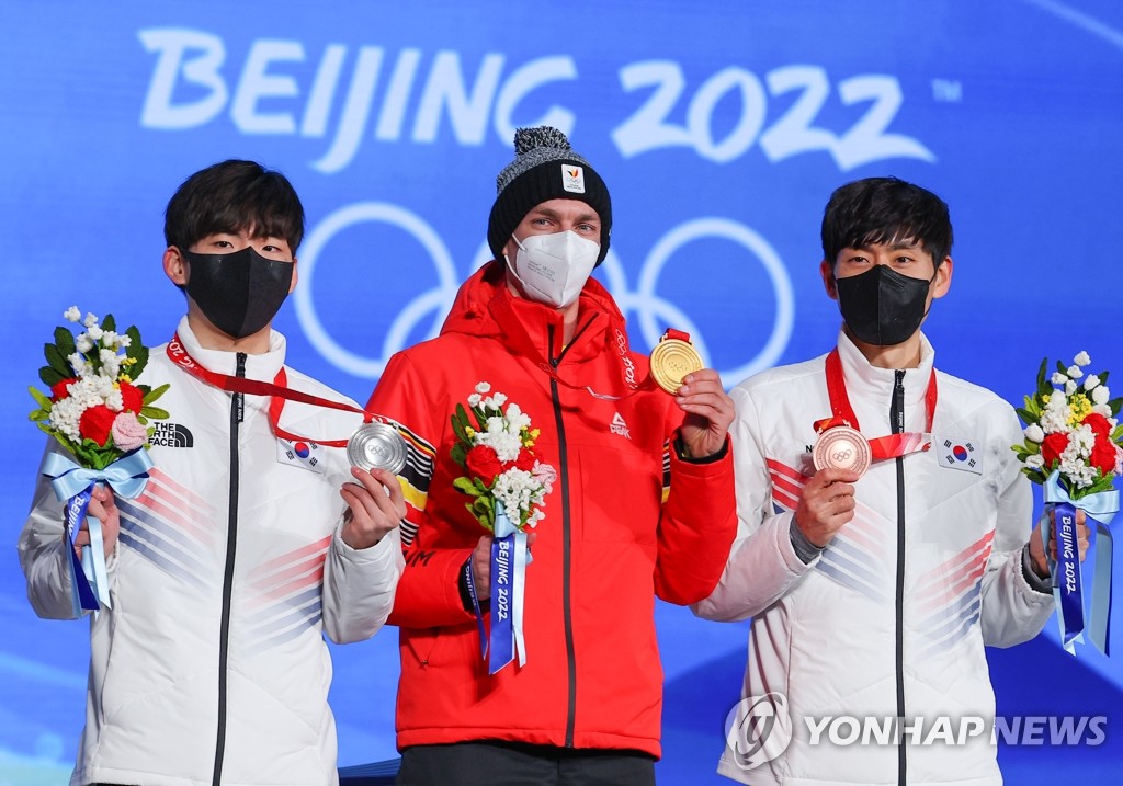 | ▲  South Korean silver medalist Chung Jae-won (L) and bronze medalist Lee Seung-hoon (R) flank the champion, Bart Swings of Belgium, during the medal ceremony for the men's mass start speed skating race at the Beijing Winter Olympics at Beijing Medal Plaza in Beijing on Feb. 19, 2022. (Yonhap) |