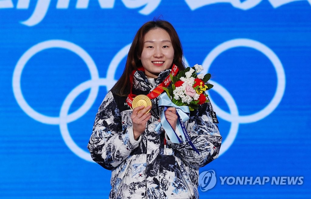 | ▲  South Korean short track speed skater Choi Min-jeong holds up her gold medal from the women's 1,500m during the medal ceremony at the Beijing Winter Olympics at Beijing Medal Plaza in Beijing on Feb. 17, 2022. (Yonhap) |