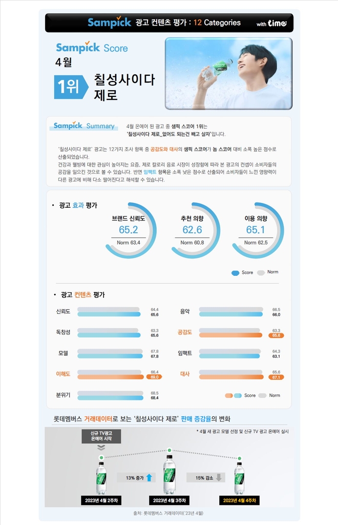 칠성사이다 제로 광고는 브랜드 신뢰도, 추천·이용 의향 등 모든 광고 효과 측정 항목에서 좋은 평가를 받았다. 콘텐츠 평가에서는 9개 측정 항목 중 이해도, 공감도, 독창성, 대사, 신뢰도의 점수가 높았다.