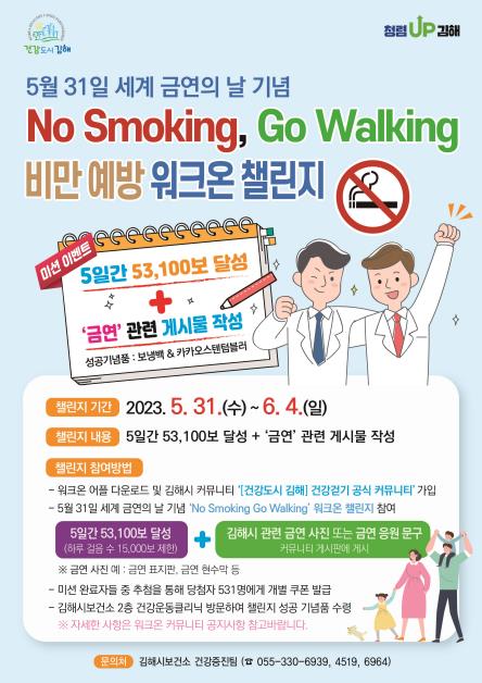 (김해=연합뉴스) 이정훈 기자 = 경남 김해시보건소는 '세계 금연의 날'(5월 31일)을 맞아 5일간 5만3천100보를 걷는 '노 스모킹, 고 워킹'(No Smoking, Go Walking) 챌린지를 한다고 22일 밝혔다.
