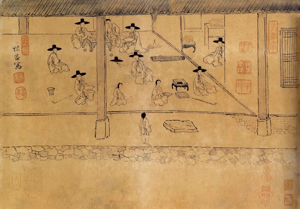 현정승집도는 1747년 복날을 맞아 강세황 선생이 청문당에서 문인들과 모여 시를 지으며 하루를 보내는 장면을 담은 그림이다.