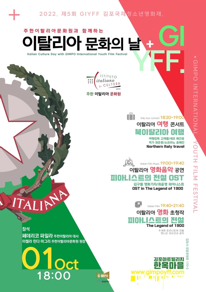 (서울=연합뉴스) 이상서 기자 = 김포국제청소년영화제(GIYFF) 조직위원회는 내달 1일 오후 경기도 김포아트빌리지 한옥마을에서 '이탈리아 문화의 날' 행사를 개최한다고 26일 밝혔다.