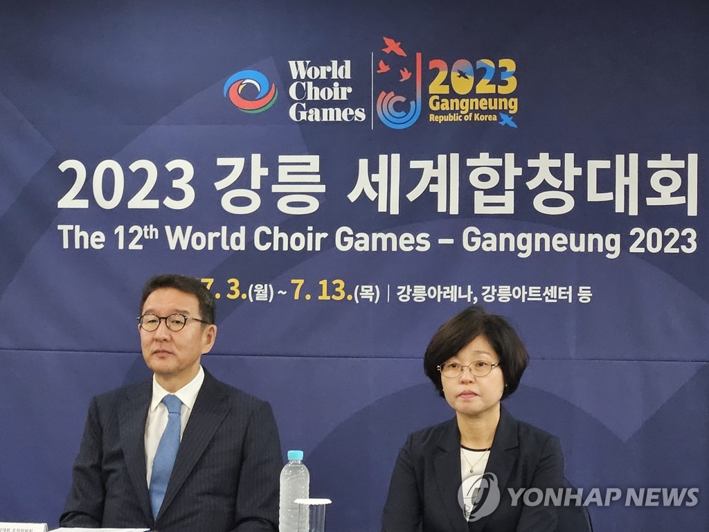 | ▲ 2023 강릉 세계합창대회 기자간담회 (서울=연합뉴스) 최주성 기자 = 21일 서울 중구 프레스센터에서 열린 '2023 강릉 세계합창대회' 기자간담회에서 허용수 강릉 세계합창대회 조직위원장(왼쪽)과 심상복 운영추진단장이 취재진의 질문을 듣고 있다. 2023.6.21 cjs@yna.co.kr |