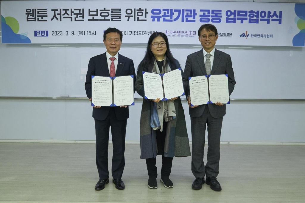 한국만화가협회는 9일 서울 중구 CKL에서 한국저작권보호원, 한국콘텐츠진흥원과 웹툰 저작권 보호를 위한 유관기관 공동 업무협약을 체결했다고 10일 밝혔다.