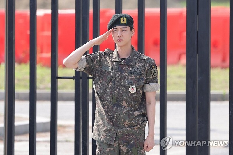 | ▲ BTS member Jin salutes at the main gate of the 5th Army Infantry Division in Yeoncheon, 61 kilometers north of Seoul, on June 12, 2024, after completing his mandatory military service. (Yonhap) |