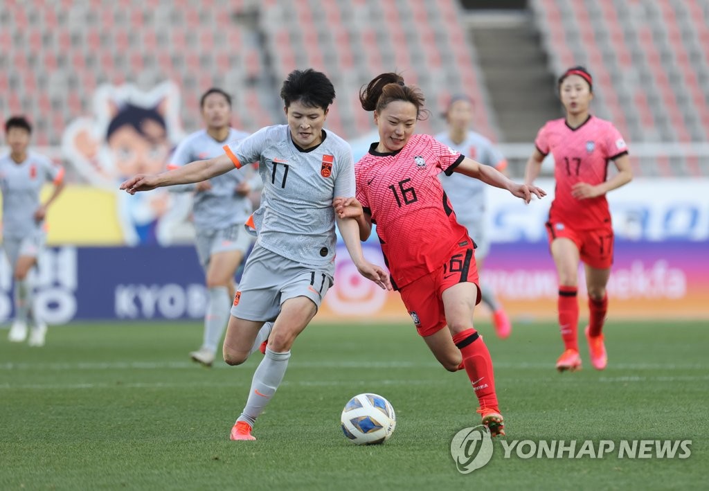 | ▲ Ji So-yun of South Korea (L) and Ma Jun of China battle for the ball during the teams' Olympic women's football qualifying match at Goyang Stadium in Goyang, Gyeonggi Province, on April 8, 2021. (Yonhap) |