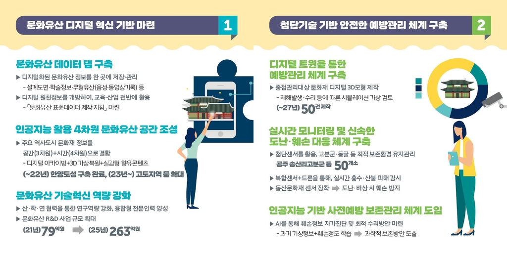 우선 문화재청은 문화유산 정보와 일하는 방식을 디지털 중심으로 전환하기로 했다. 이를 위해 문화유산 디지털 정보를 생산·저장·관리하는 '데이터 댐'을 2030년까지 구축하고, 인공지능(AI)으로 문화유산 4차원 공간을 조성해 주요 문화유산 정보를 디지털 정보로 구현할 계획이다. 또 디지털 정보를 공개해 모든 국민이 활용할 수 있도록 하고, 디지털 문화유산 전환을 위해 연구개발 및 전문 인력 양성에 힘쓸 방침이다.