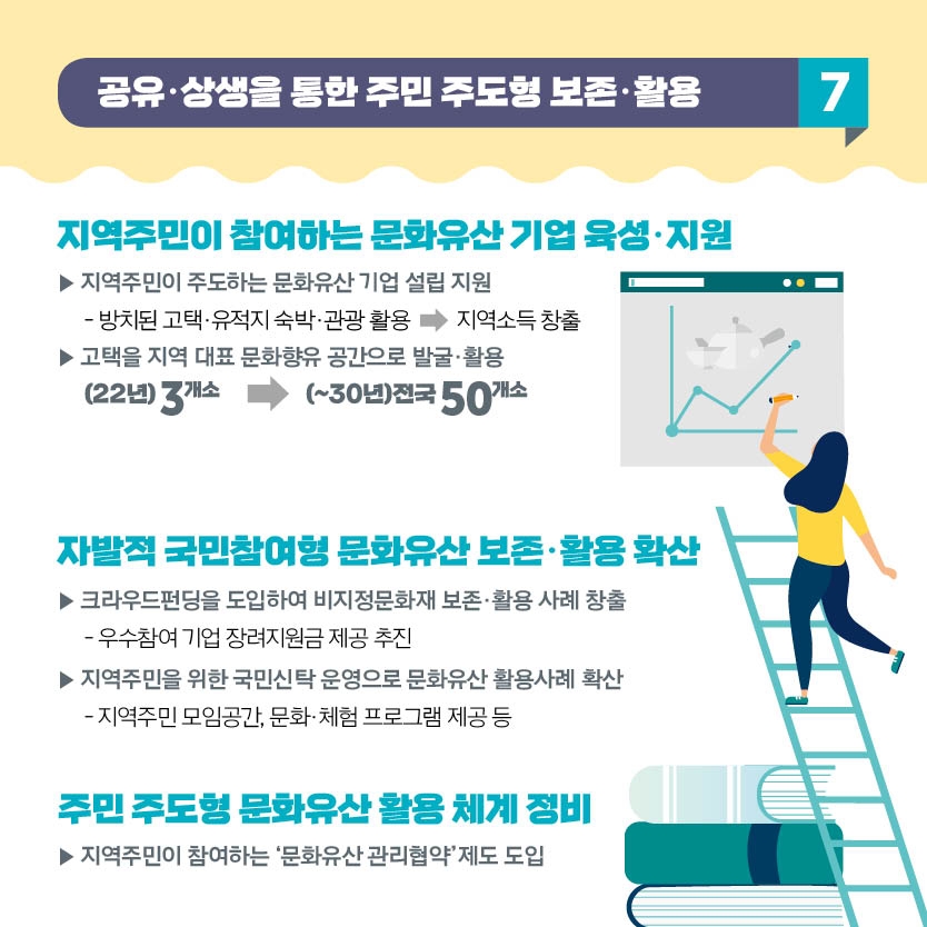 마지막으로 지역 주민이 문화유산을 활용해 공동체를 회복하고 경제적 가치를 창출하도록 할 계획이다. 이를 위해 문화유산 기업을 육성·지원하고, 생활밀착형 문화유산의 보존·활용을 확산하며, 주민 주도의 문화유산 활용 체계를 정비하기로 했다.