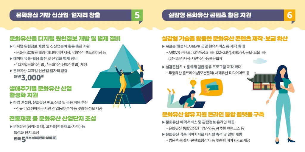 또 문화유산을 기반으로 한 신산업·일자리 창출을 추진한다. 문화유산 디지털 정보를 무료로 개방해 교육, 게임, 수리 등 산업 분야에 활용될 수 있게 하고, 문화유산 시장에 경영과 자금을 지원하며, 문화유산 산업단지를 조성할 계획이다.
