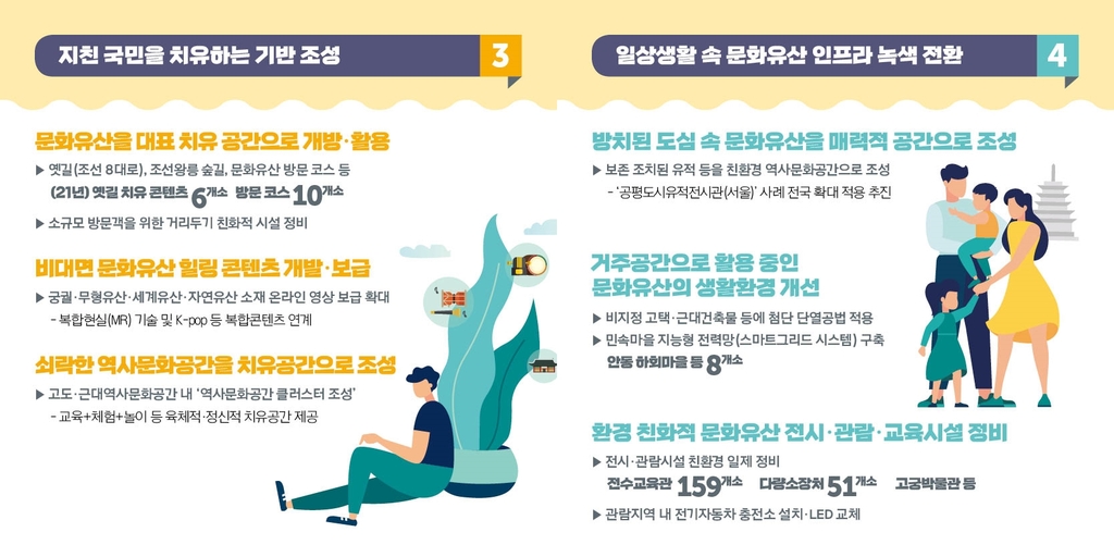 또 조선왕릉 숲길과 명승 옛길을 치유 공간으로 조성하고, 궁궐·무형유산·세계유산 등을 온라인 영상으로 제작·보급하는 비대면 문화유산 치유 콘텐츠 제공, 고도(古都)와 근대역사문화공간 10개소를 교육과 체험, 놀이 등을 위한 공간으로 운영하는 치유형 역사문화공간 조성 등을 추진한다.
