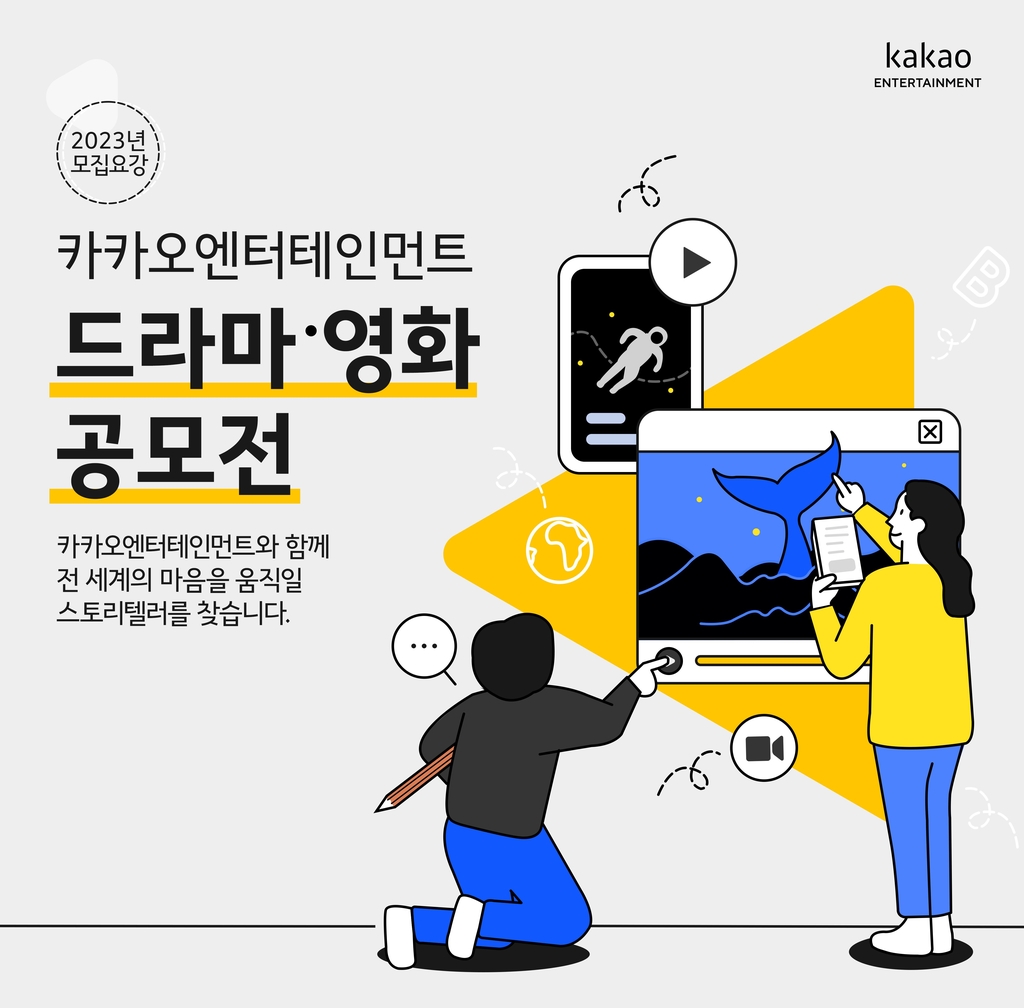 (서울=연합뉴스) 황재하 기자 = 카카오엔터테인먼트는 콘텐츠 산업의 성장을 위해 '2023 카카오엔터테인먼트 드라마·영화 공모전'을 개최한다고 16일 밝혔다.