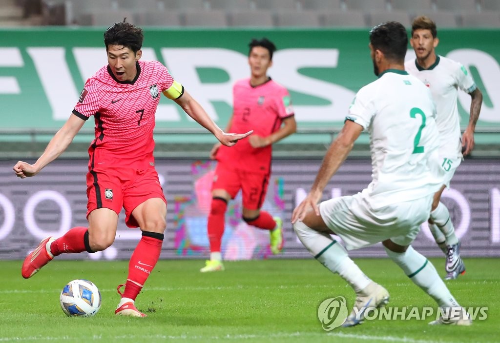 | ▲  Son Heung-min of South Korea (L) tries to make a pass past Ahmed Ibrahim of Iraq during the teams' Group A match in the final Asian qualifying round for the 2022 FIFA World Cup at Seoul World Cup Stadium in Seoul on Sept. 2, 2021. (Yonhap) |