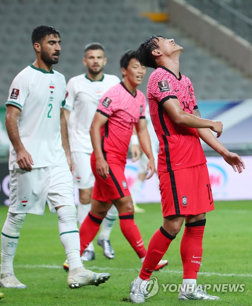 | ▲  Hong Chul of South Korea (R) reacts to a missed scoring opportunity against Iraq during the teams' Group A match in the final Asian qualifying round for the 2022 FIFA World Cup at Seoul World Cup Stadium in Seoul on Sept. 2, 2021. (Yonhap) |