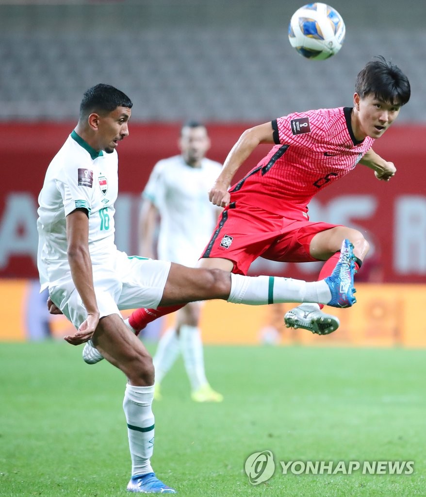 | ▲  Hwang In-beom of South Korea (R) makes a pass past Amir Al-Ammari of Iraq during the teams' Group A match in the final Asian qualifying round for the 2022 FIFA World Cup at Seoul World Cup Stadium in Seoul on Sept. 2, 2021. (Yonhap) |